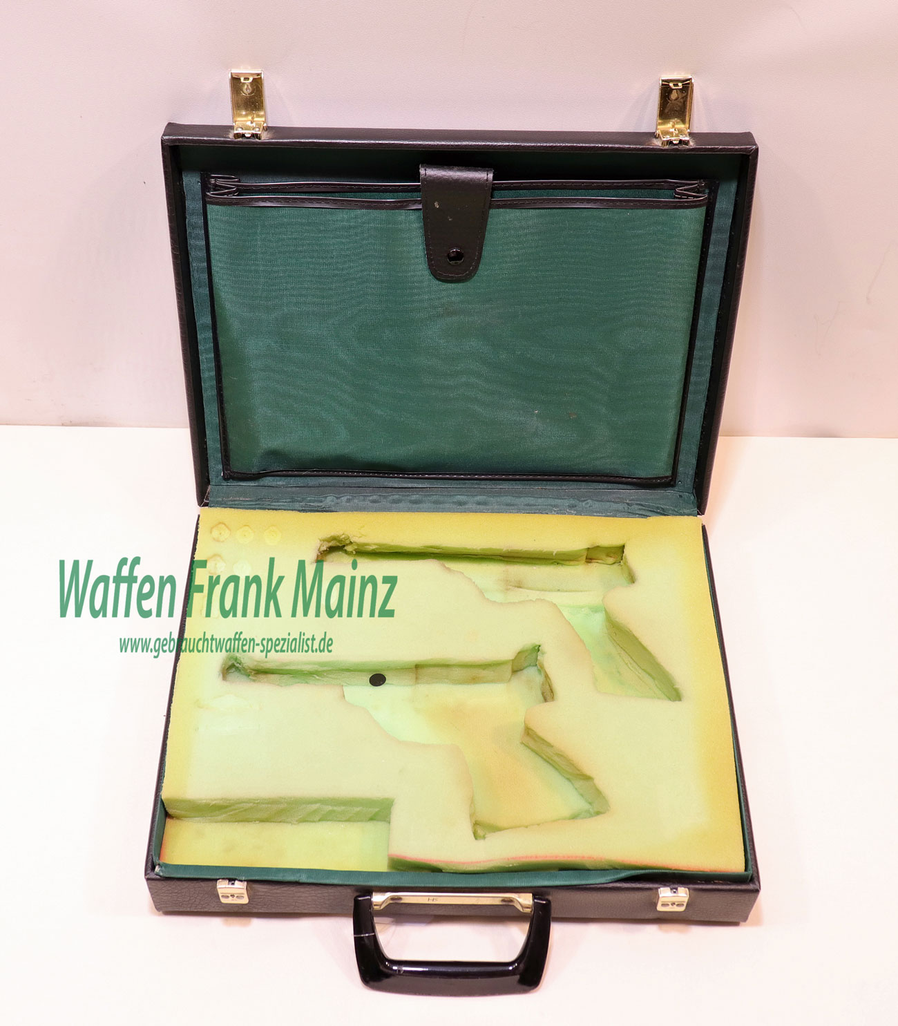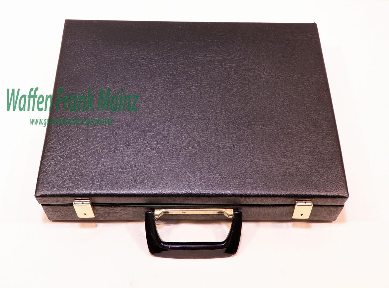 Aktenkoffer mit Schaumstoffeinlage für zwei Faustfeuerwaffen, mit Deckelklappe für Zubehör, schwarzer Kunststoffbezug, zwei Schlösser (einfache Bartschlüssel NICHT vorhanden!)