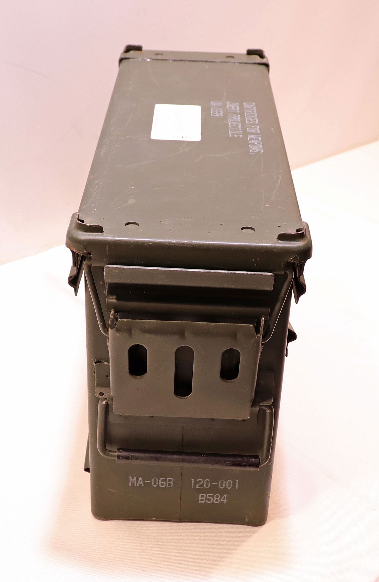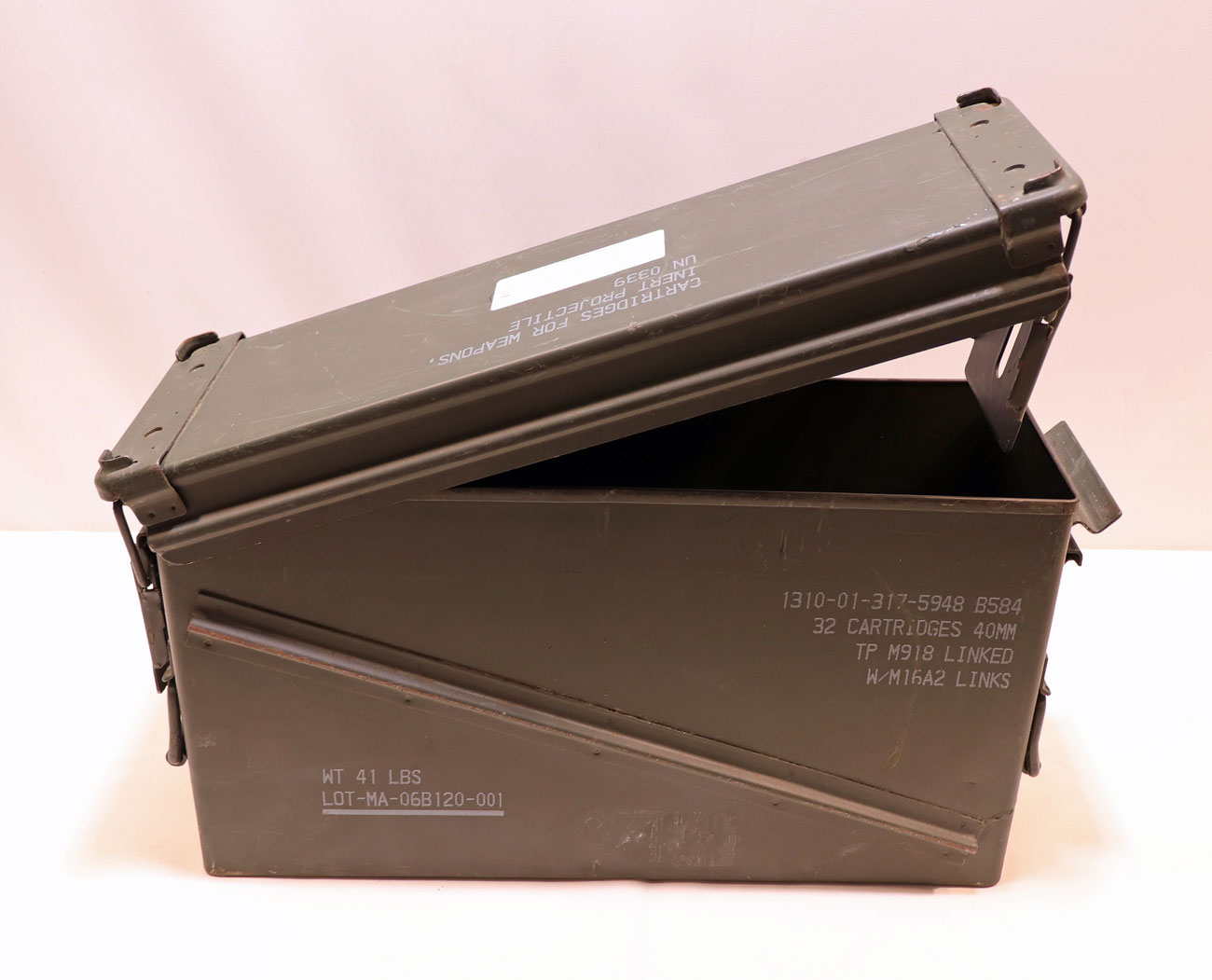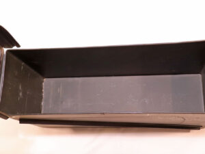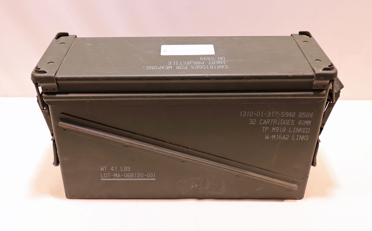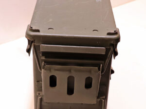 Baujahr: um 2000, Zustand: 2-3, Innenmaß: 44×13,5x25cm,aus grün beschichtetem Stahlblech, mit luft-/wasserdichtem abnehmbarem Deckel, zwei gepolsterte Tragegriffe, noch mit kompletter militärische Beschriftung, so z.B. „32 Cartridges 40mm TP M918 Linked“