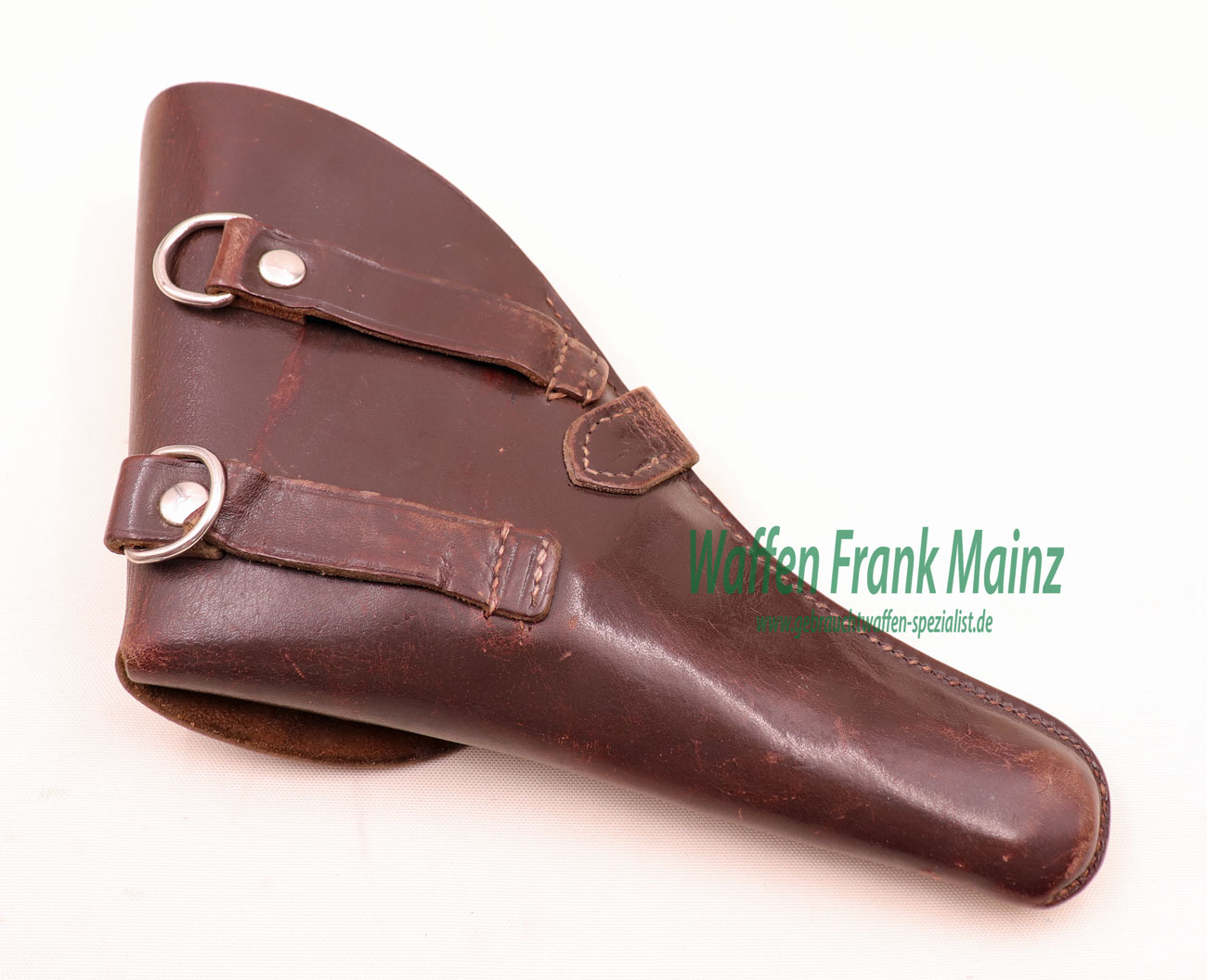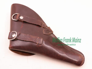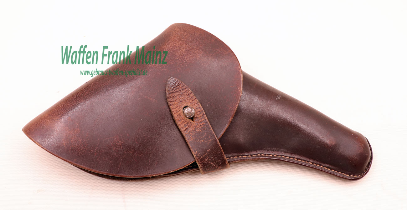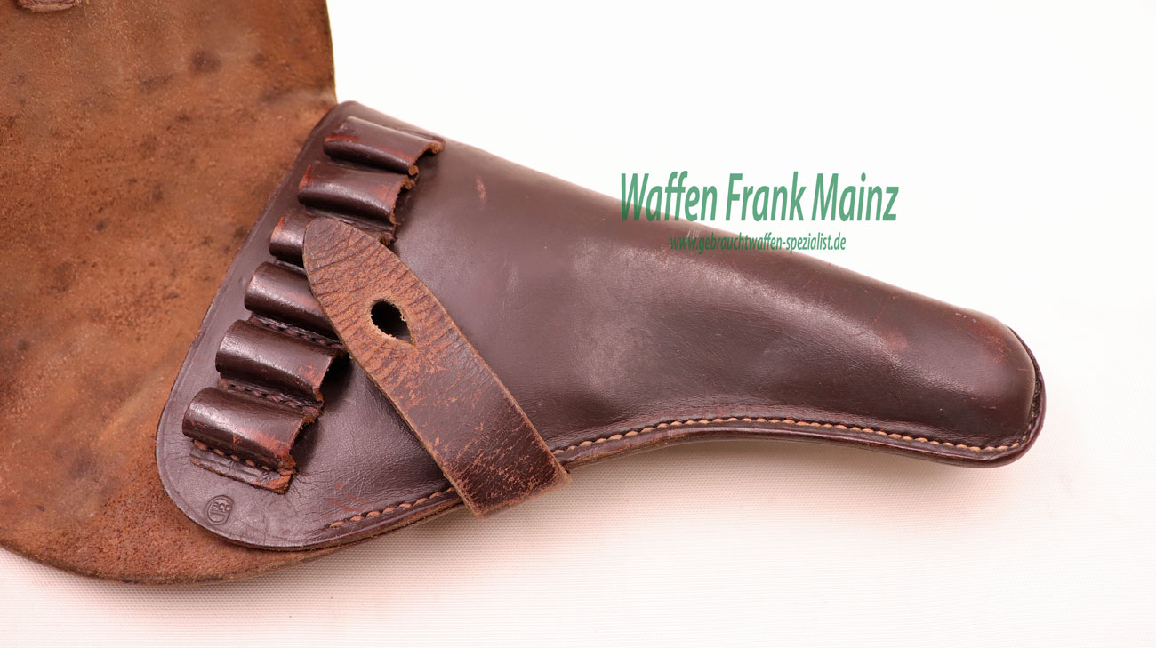 Gürtelholster aus braunem Sattelleder in Behördenausführung (Polizei usw.), für Revolver bis 4″ Lauflänge (zum Beispiel S&W M&P, Enfield), große Lederklappe mit 6 aufgenähten Patronenschlaufen zum Tragen am Gürtel, links oder rechts, inkl. Ösen für Trageriemen