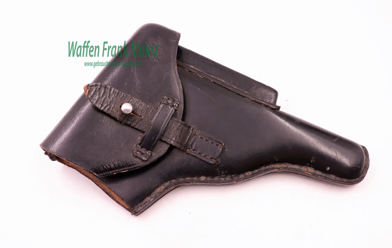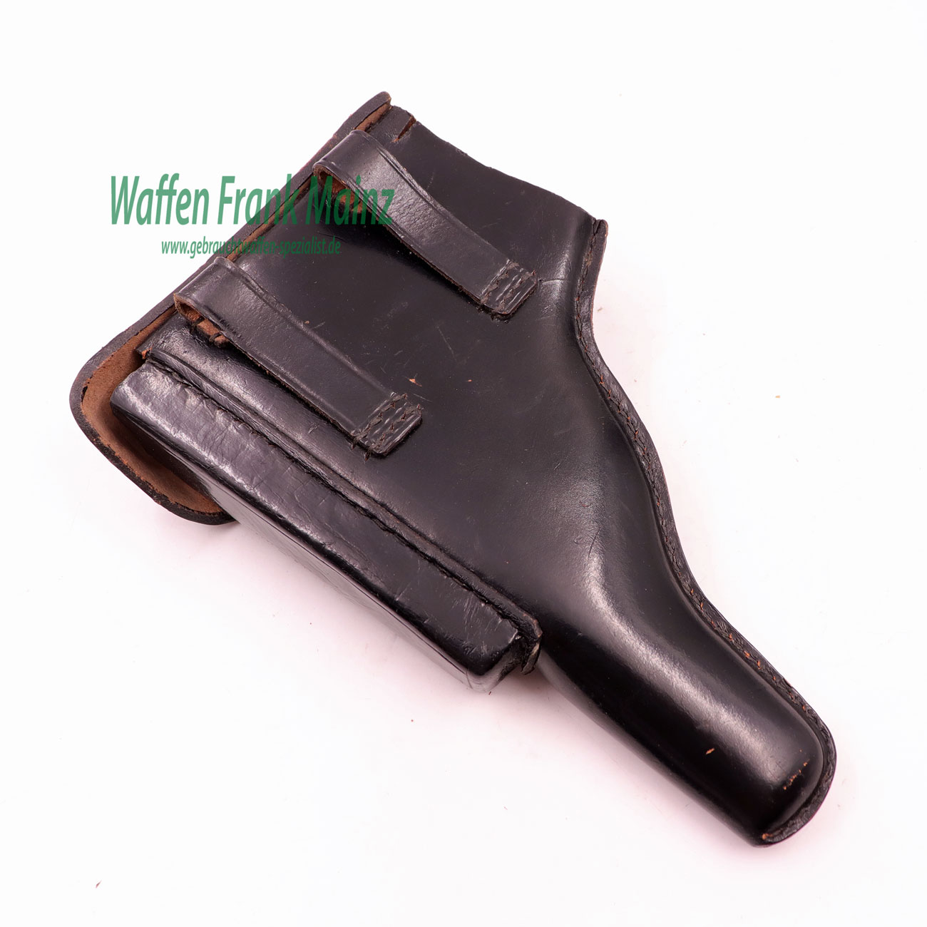 aus schwarzem Rindleder, mit aufgenähter Magazintasche, mit leicht fachlich abgeänderter Form im Bereich des Griffstücks