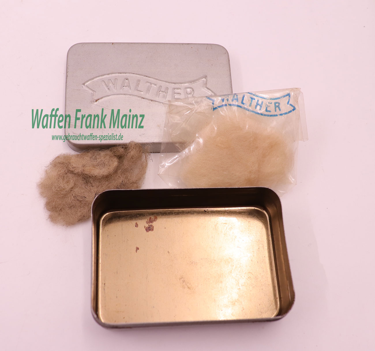 matt verchromte Blechdose für Reinigungsmaterial, um 1935, Maße 75x52x22mm, mit eingeprägtem Walther Banner, wurde als Zubehör in der Vorkriegsproduktion zur Waffe mitgeliefert