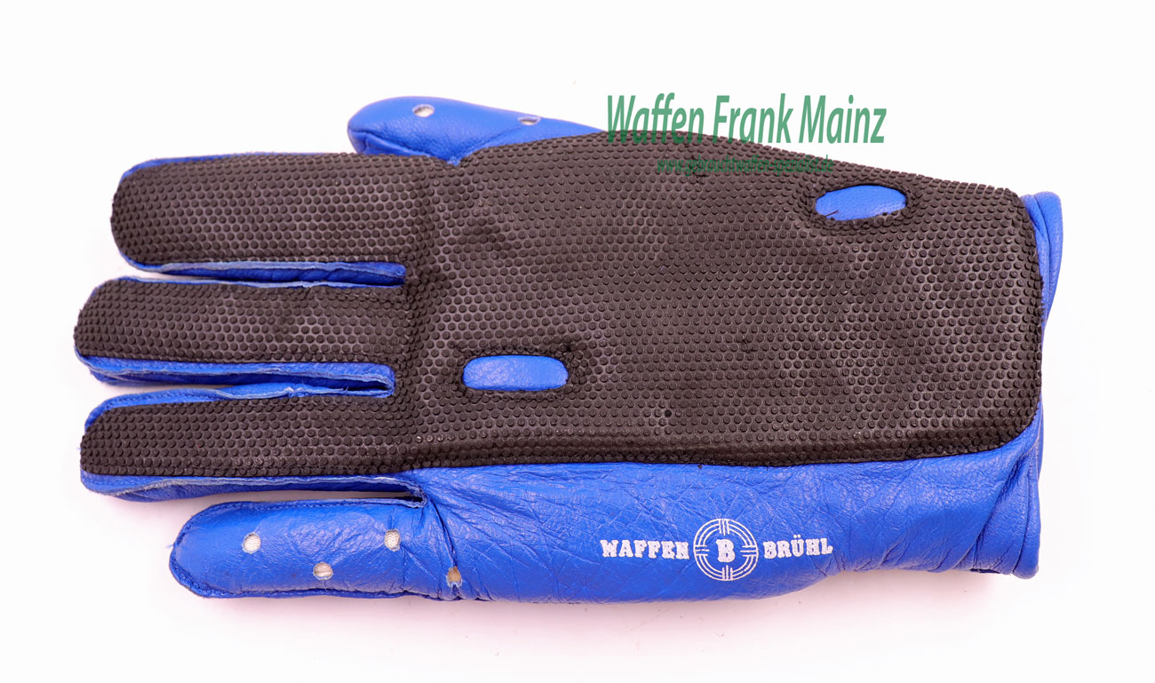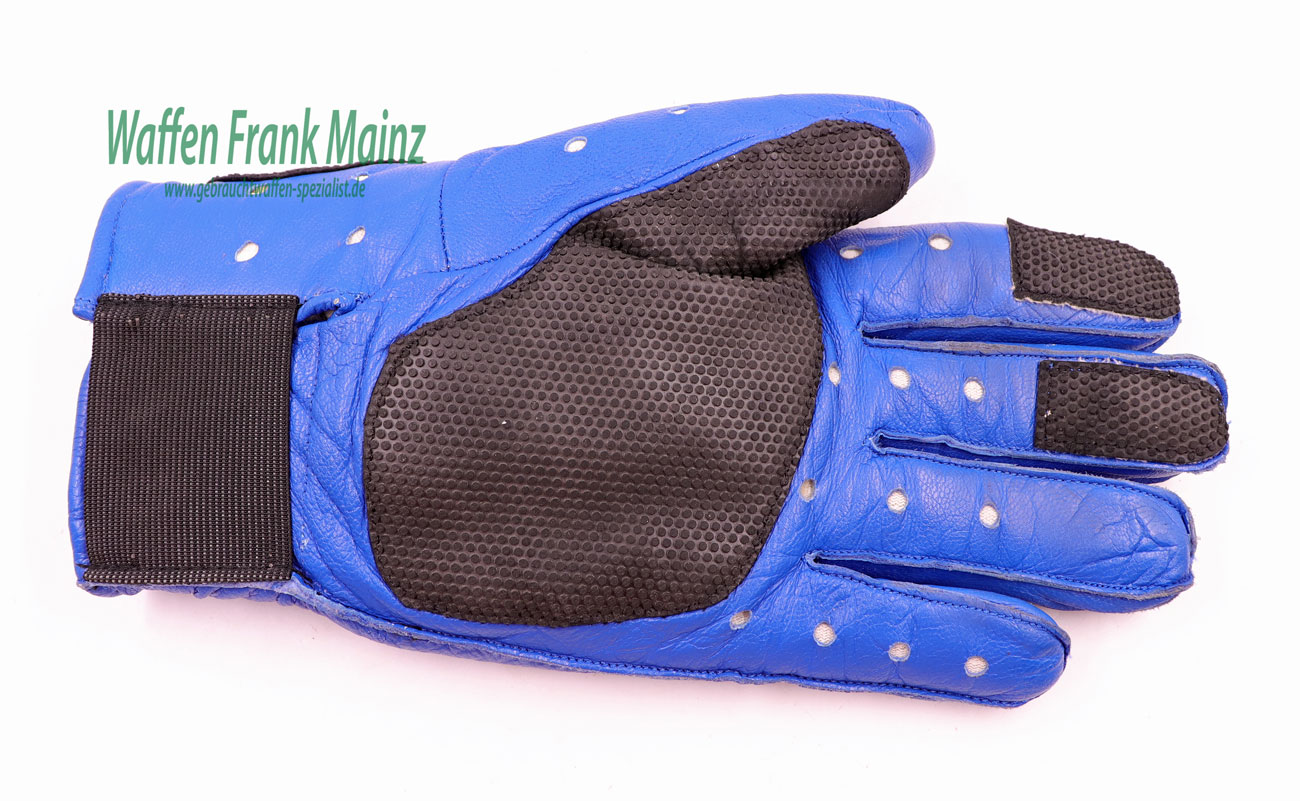 hochwertiger Fünffinger-Schießhandschuh für Rechtsschützen, mit blauem Kunstleder, und Noppengummibelag, sowie ausreichende Lüftungslöcher,