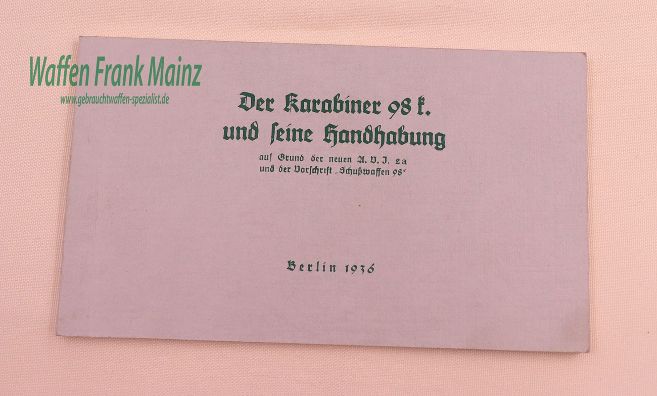 Original Bedienungsanleitung für Karabiner 98 in deutsch, Berlin 1936, 56-seitig, mit mehreren Stempeln des Vorbesitzers auf den Innenseiten.