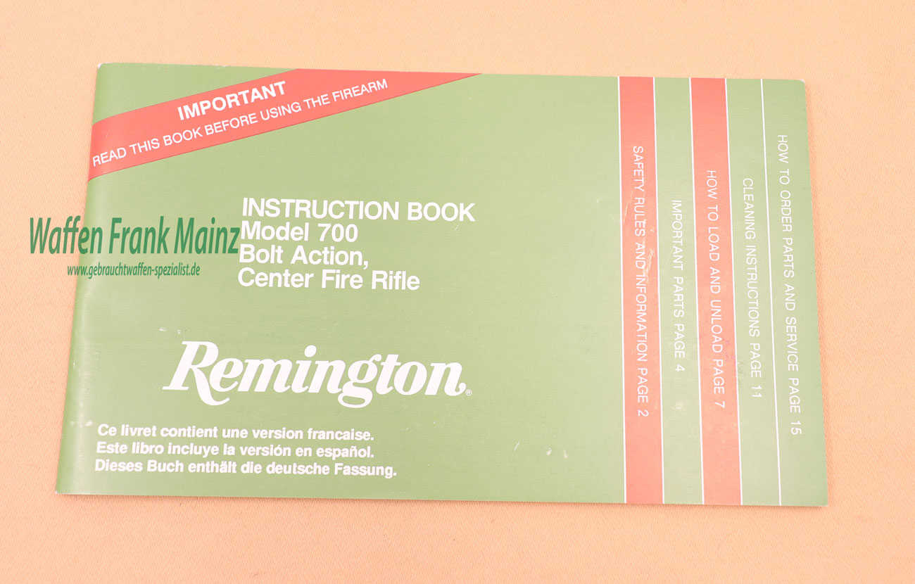 Original Bedienungsanleitung für Remington Mod. 700 in englisch, französisch, spanisch und deutsch, jede Sprache 17-seitig