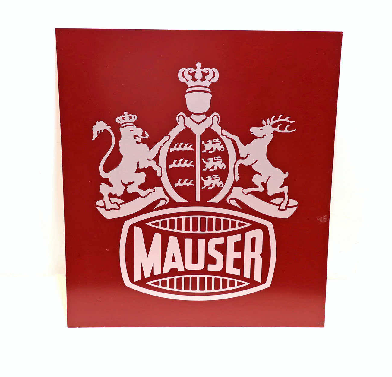 ehemaliges Deko-/Reklameschild auf 2mm Kunststoffplatte, mit silberfarbenem Mauserlogo…ein Stück für den Mausersammler…