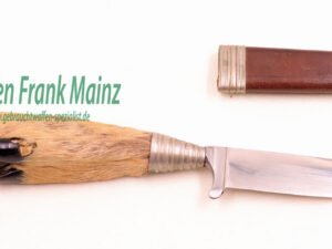 klassischer Trachtennicker, mit eingeschobener Klinge in einem Rehlauf (Fuß), Klinge mit voller Beschriftung, nicht überarbeitet, Griff im Bereich der Hornmasse mit sichtbarer Schädigung (durch beseitigten Hornkäfer, kann mit etwas Geschick zu 95% beseitigt werden)